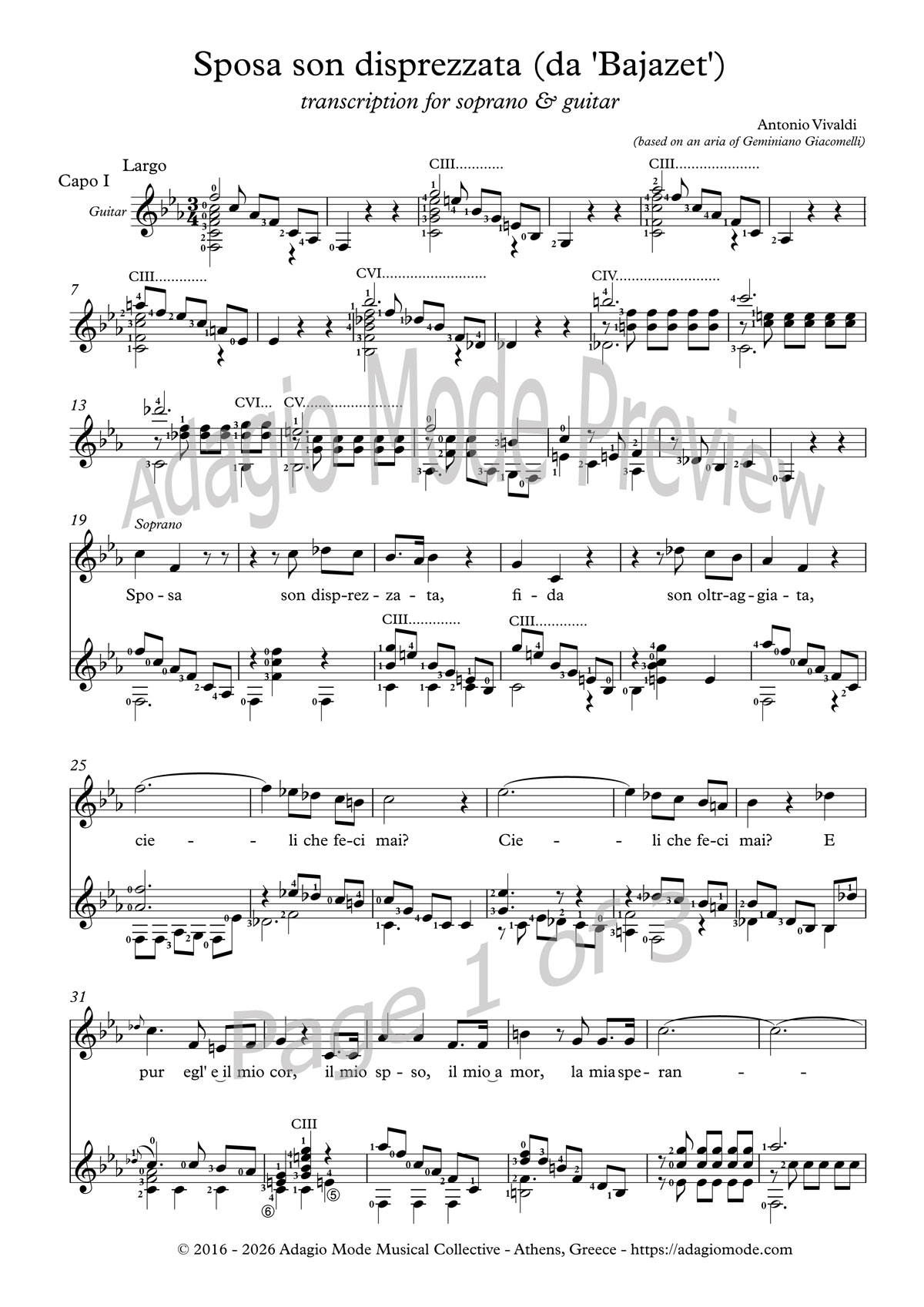 Transcription for soprano & guitar, with fingering in F minor and Capo I.